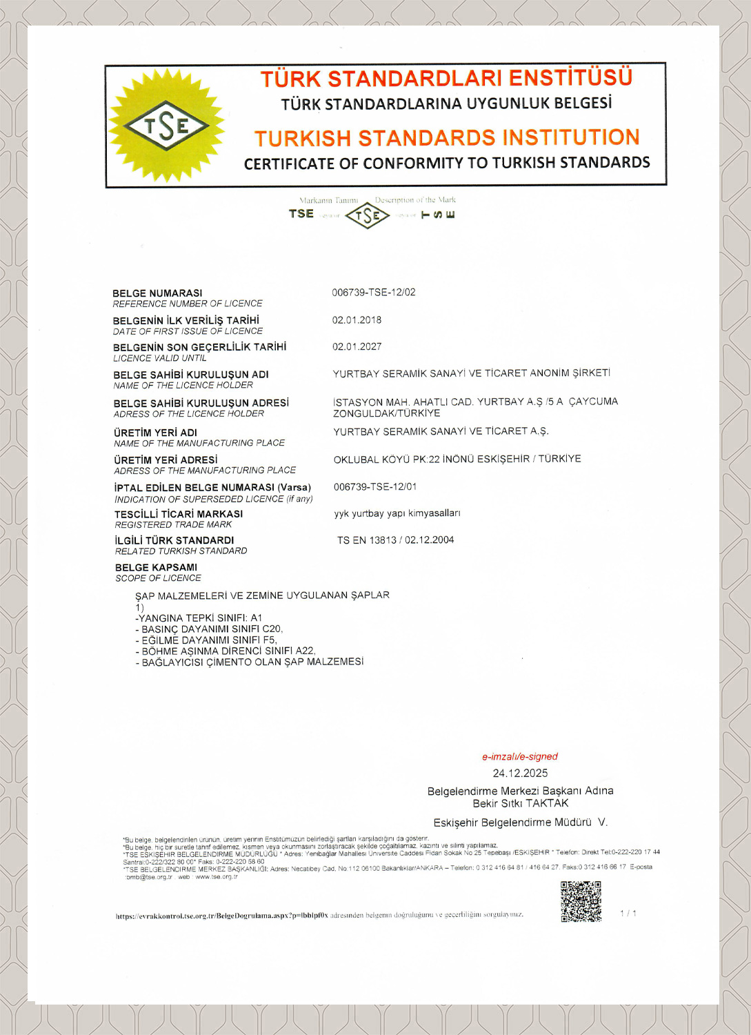TS EN 12004-1 Seramik Yapıştırıcılar Ürün Uyg. Bel.Eskişehir