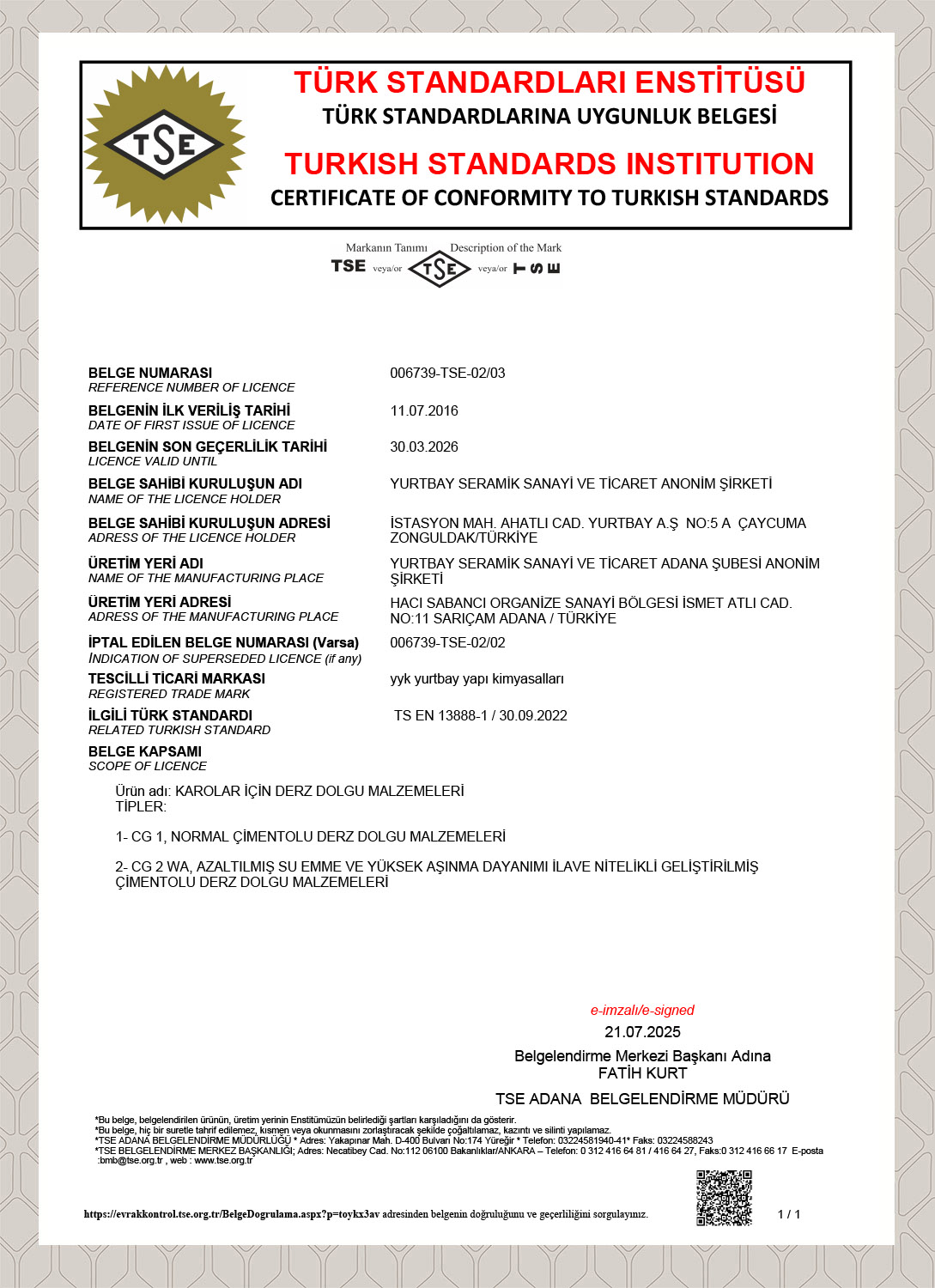 TS EN 13888 Derz Dolgu Ürün Uyg. Belg. Adana 2023