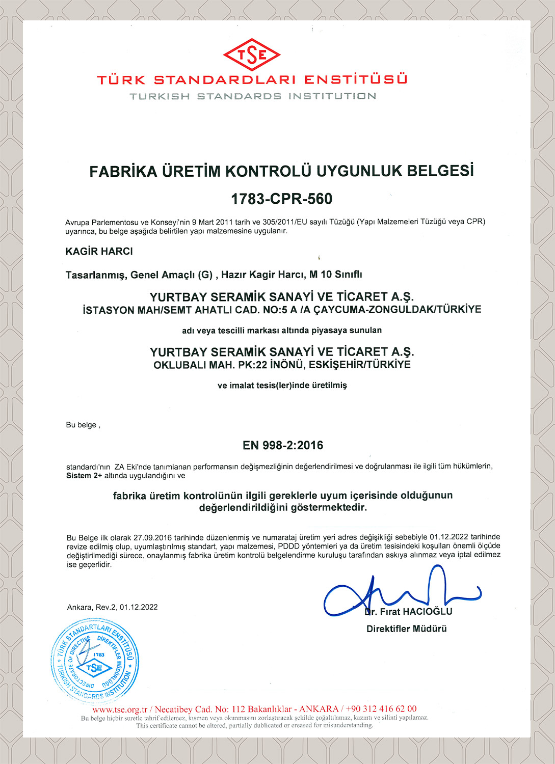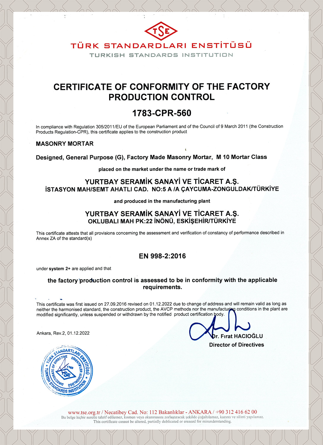 TS 998-2 Kagir Harcı Ürün Uyg. Belgesi 2020